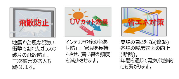 ・飛散防止 ・UVカット ・省エネ効果 ・遮熱 ・防犯 ・防虫効果 ・プライバシー保護
