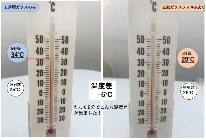 窓ガラスのみ(フィルムなし)と窓フィルムありではたった5分で上昇温度に6℃も差がありました!
