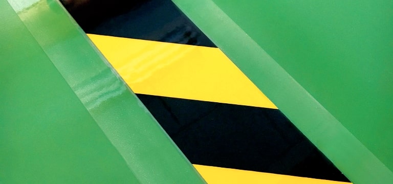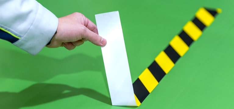 歩行帯を「塗る」から「貼る」へ 工場や施設の床に綺麗に長持ちする歩行帯を時短でつくる「超耐久歩行帯シート」です。