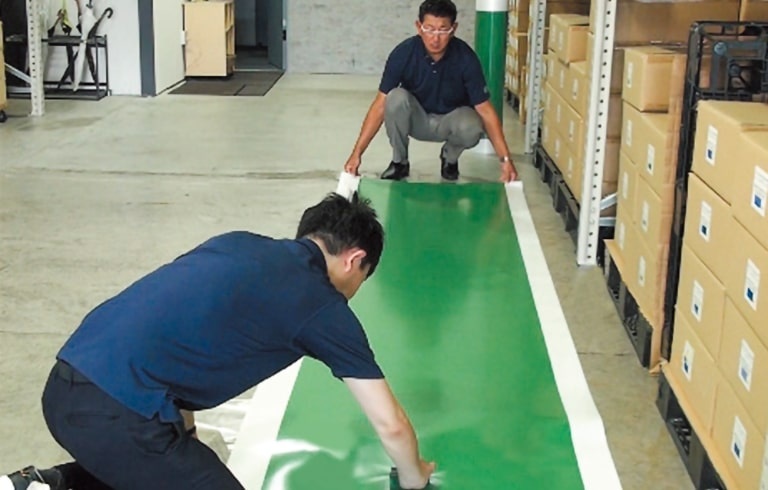 倉庫や工場の床面表示、テーブルなどの家具や什器、壁⾯やガラス、印刷ラミネートフィルムの上などに床保護シートとして貼り付けることで、傷や汚れを防ぎ、表面を保護します。