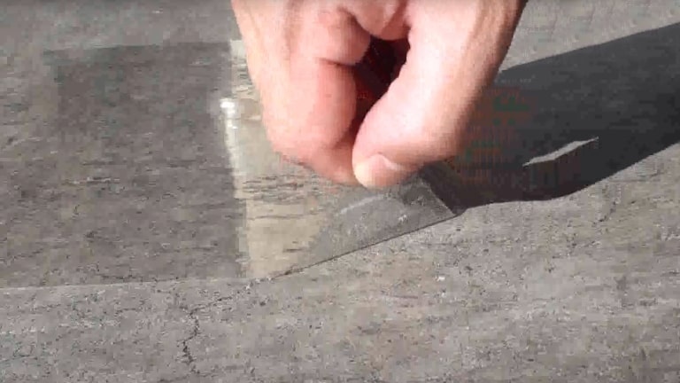 先端の剥離紙を10㎝ほどめくります。たわみが生じないよう、剥離紙の折り込み箇所の手前から、ググッと押さえつけるようにして、しっかりと端部を貼り付けます。