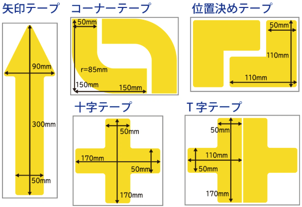 案内標示の矢印テープ、整理整頓に役立つ位置決めテープ・十字テープ・T字テープ、コーナーテープはラインテープとのジョイントとしてご活用頂けます。