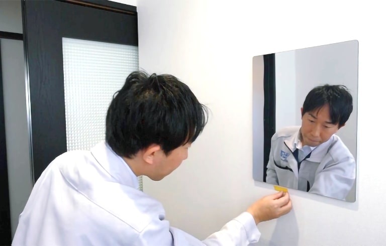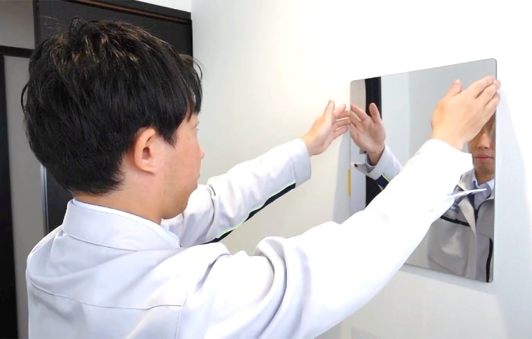 最後に全体をチェックし、しっかり鏡が粘着しているか確認してください。※粘着不良があると、剥がれ等の原因になります。