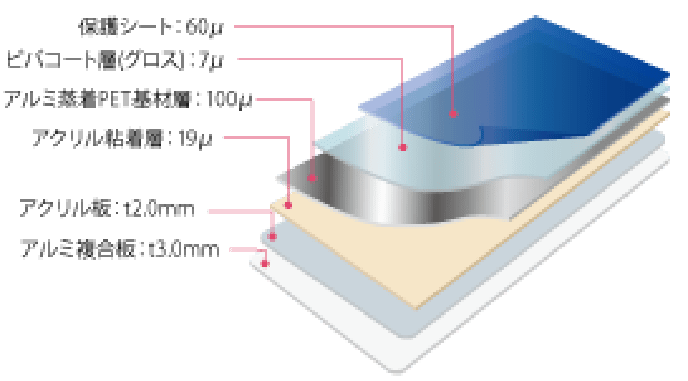 基材部分はアルミ複合板とアクリル板、その上に、鏡面となるアルミ蒸着PET基材層、超耐久ビバコート層、保護シートを重ねた構造となっております。基材がアクリルの性質上、サイズが大きくなると歪みが生じやすくなるため、歪みを少なく利用する場合は、規格サイズ(440mm×350mm)を推奨いたします。