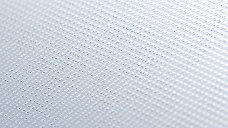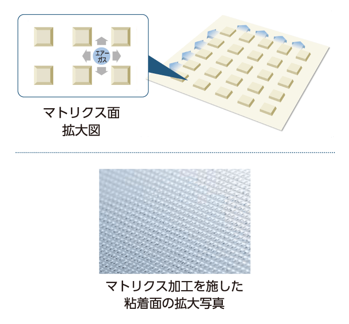 "マトリクス"は特殊粘着加工(マトリクス加工)により粘着面に無数の小さい凹凸を形成させており、その縦横に走る極細の溝からエアー やガスが抜ける構造になっています。縦横に走る溝から空気(エアーやガス)が抜け、どなたでも簡単に貼ることができます。