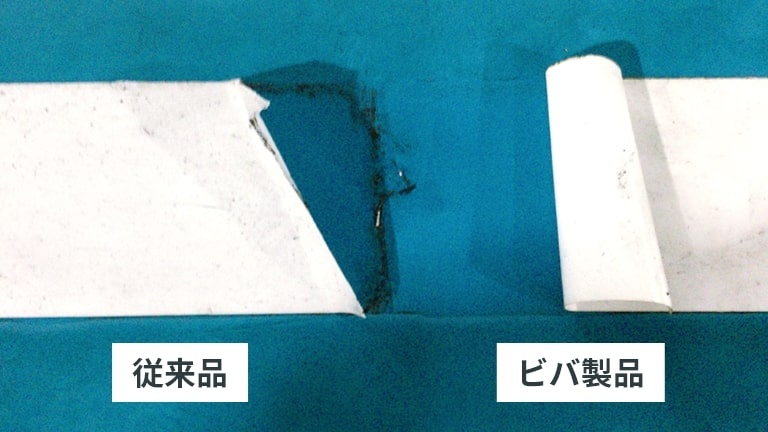 ラインテープの耐摩耗性は、従来品に比べ傷が非常に付きにくく光沢が落ちにくいため、ラインテープを綺麗に⻑持ちさせられます。