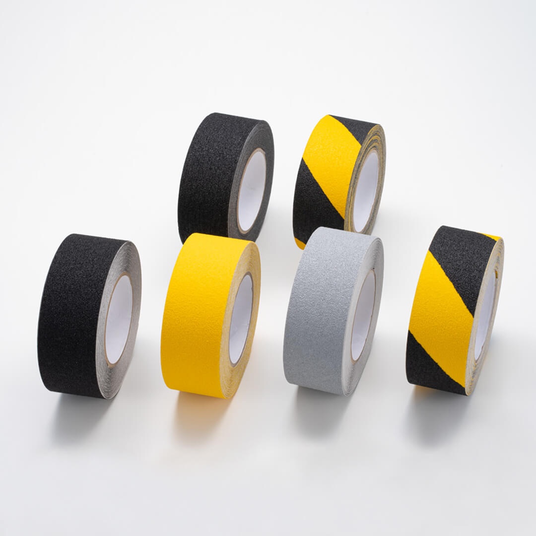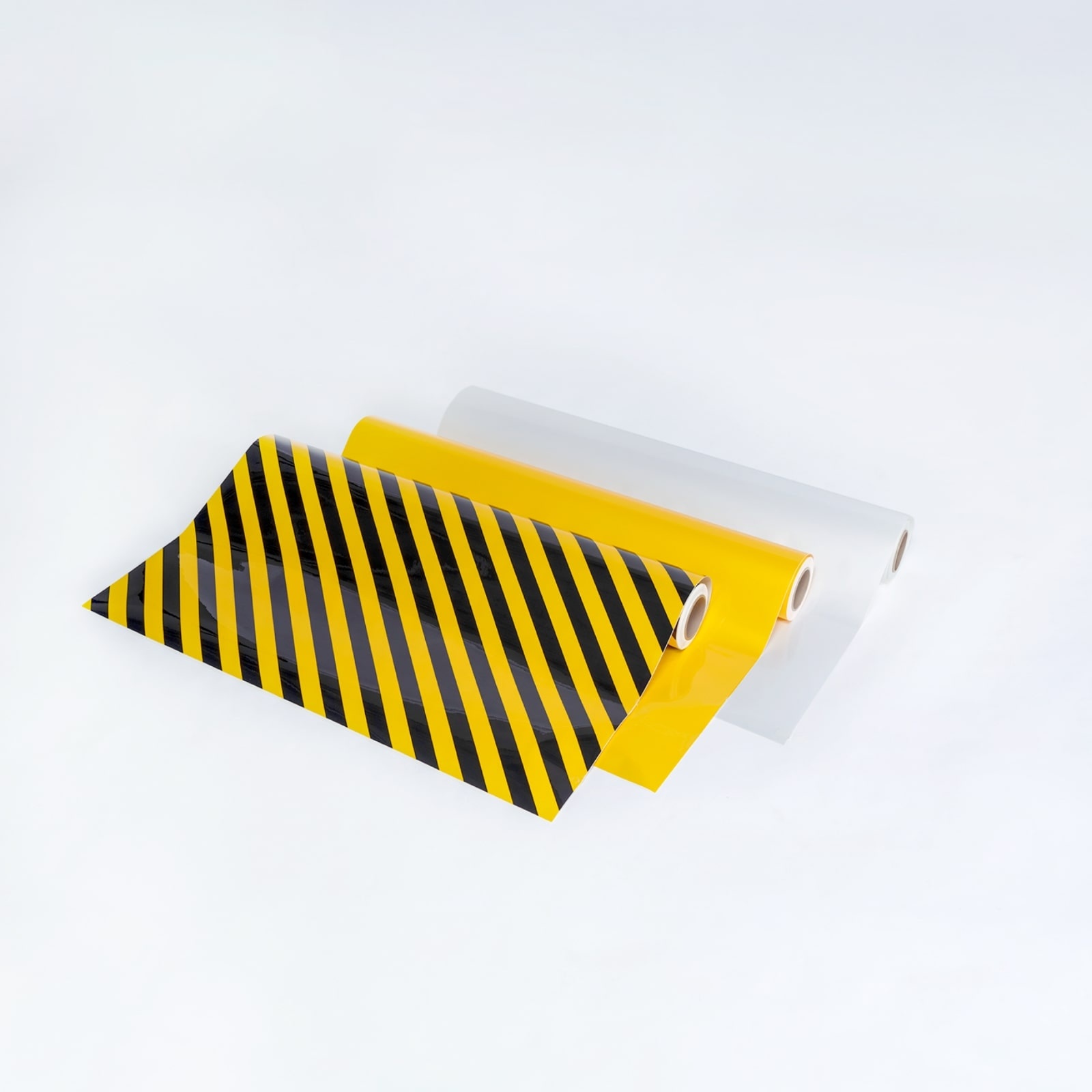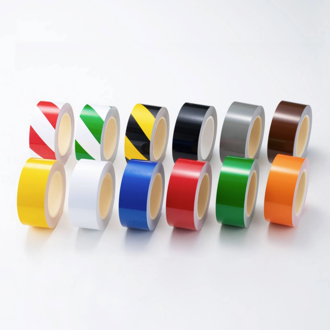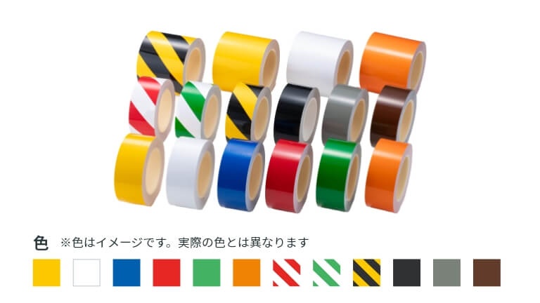 高耐久なラインテープとして黄色、青、赤、緑、オレンジやトラ柄など、幅広くご利用いただけます。