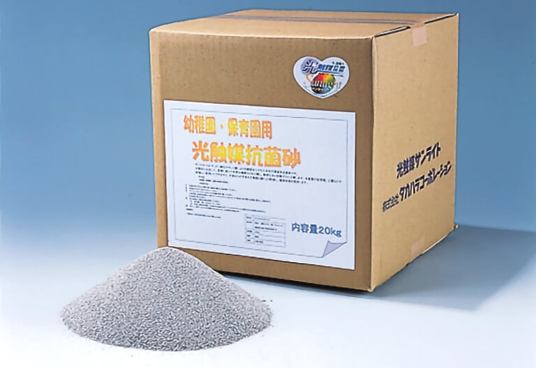 光触媒加工を施した砂です。(1箱20kg入り)砂場1㎡ あたり10kgの割合で使用。安全で変質がないので長期間使用可能です。